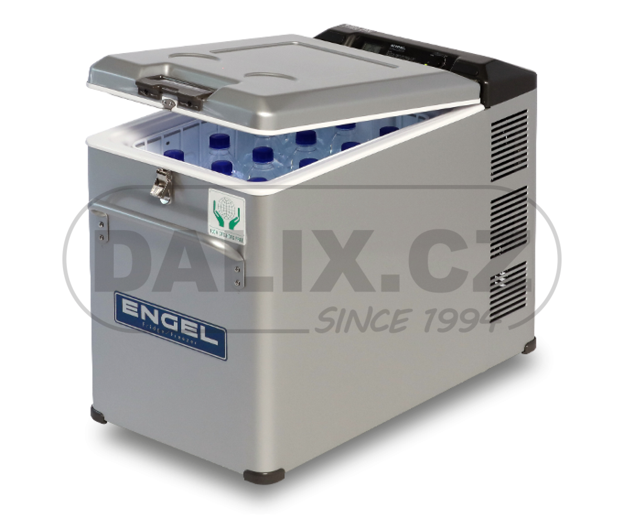 Do boxu lze vložit dvoulitrové láhve. Víko lze vysunutím do boku jednoduše odejmout. Na ovládacím panelu je zabudovaný přesný digitální teploměr.