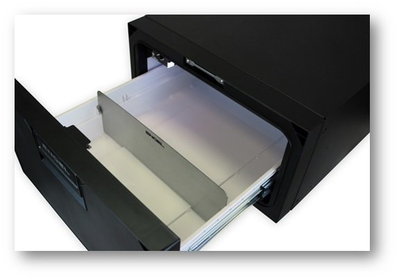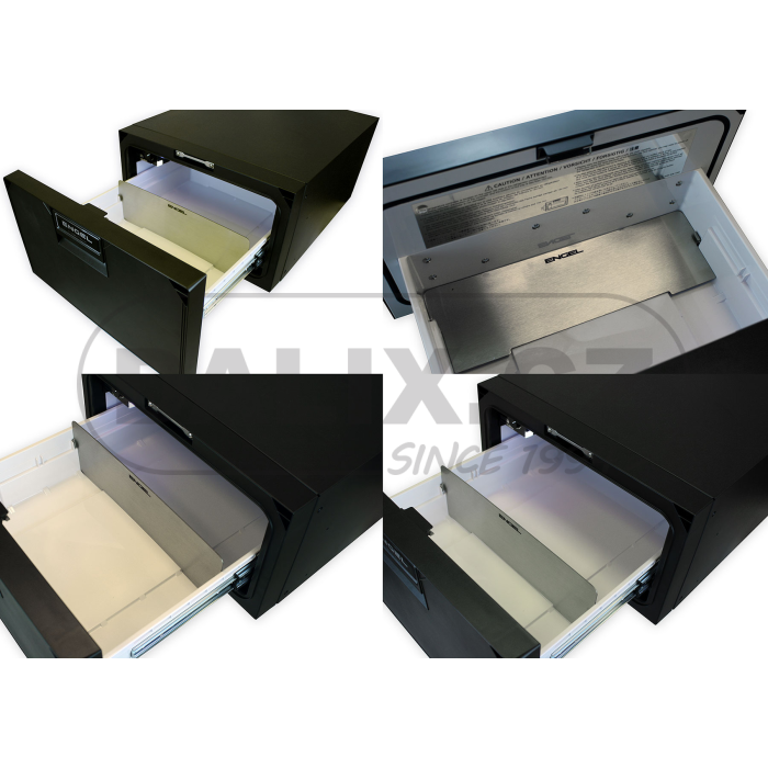 Dělicí přepážka vnitřního prostoru zásuvky autolednice ENGEL SB30 z broušeného nerezového plechu slouží např. k oddělení potravin a nápojů a to ve dvou volitelných vzdálenostech. V případě, že není přepážka využívána, lze ji vyjmout a uložit do přední části dna zásuvky. Přepážka není standardně součástí autolednice, jedná se o volitelné příslušenství.