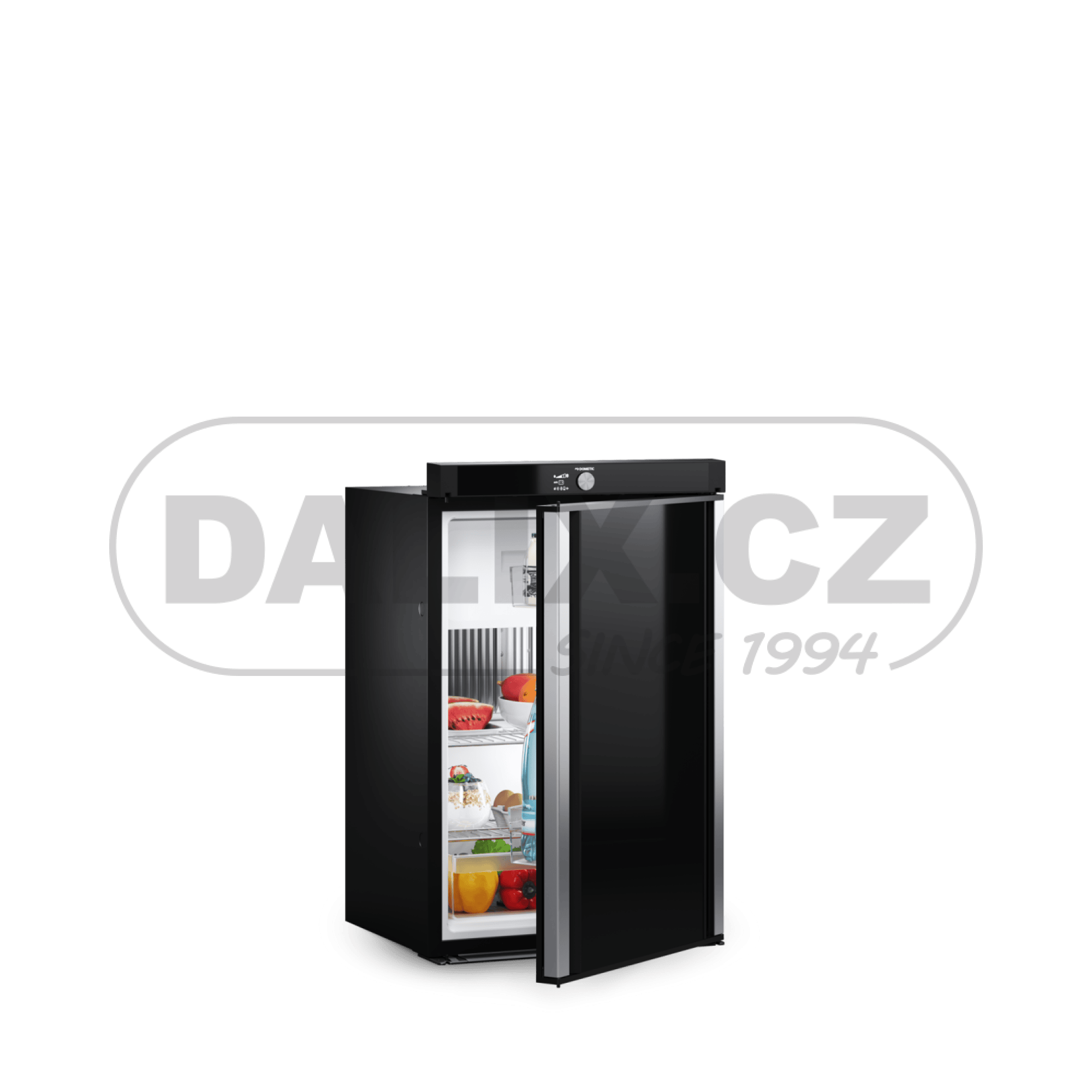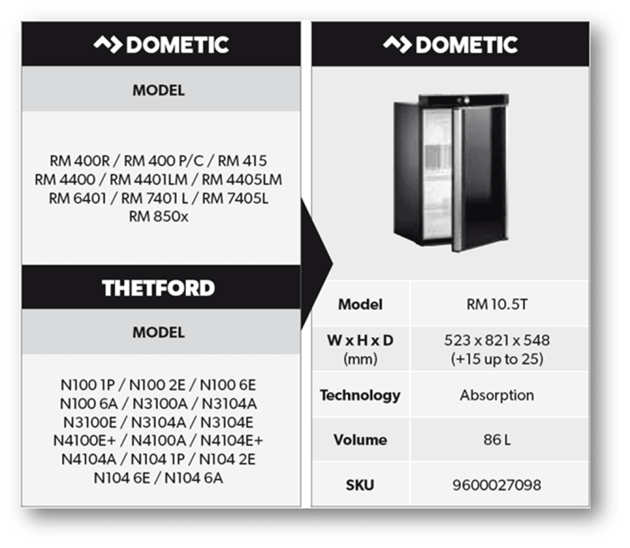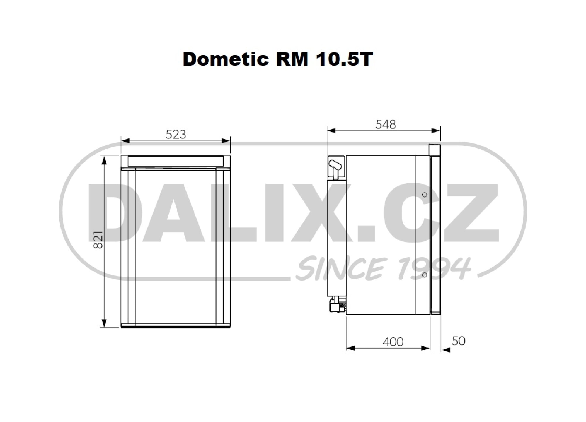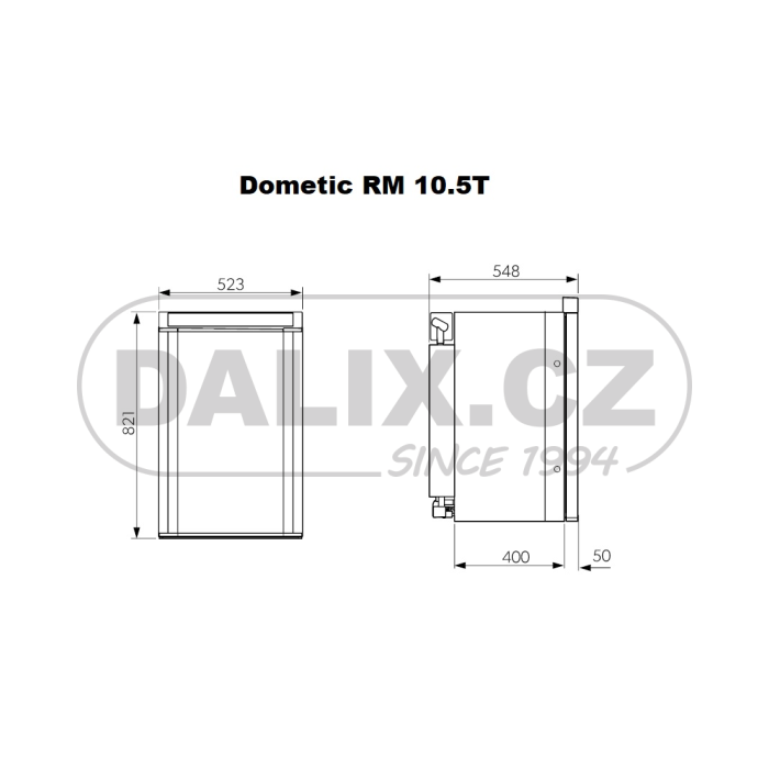 Nový model absorpční chladničky Dometic řady RM10.5 svými rozměry nahrazuje předešlé modely lednic Dometic (viz.tabulka) a vybrané modely lednic THETFORD. Chladnička Dometic řady RM 10.5 je vestavná absorpční chladnička vhodná pro instalaci v karavanech a obytných vozech. Chladnička je určena ke chlazení, hlubokému mražení (mrazicí přihrádka) a k uchovávání potravin. Absorpční chladnička je určena k provozu na napájení stejnosměrným proudem (12 V), střídavým proudem 230V a na zkapalněný plyn (propan nebo butan). Chladnička má automatický provozní režim, který vybírá nejhospodárnější druh energie. Provoz chladničky je bezhlučný. Pro samostatný provoz na plyn musí být vloženy volitelné baterie. Jinak je nezbytné připojit stejnosměrný nebo střídavý proud. Při použití 12 baterií (typ AA) lze chladničku provozovat samostatně po dobu 2 až 3 dnů. Není-li k dispozici vlastní napájecí zdroj 12 V stejnosměrného proudu vozidla nebo je-li napájení během provozu přístroje vypnuto, elektronická řídicí jednotka se automaticky přepne na napájení z interní baterie (pokud jsou baterie vloženy). Společnost DALIX, s.r.o. dodává chladničky Dometic řady RM 10.5 v provedení RM10.5T, RMS10.5T, RMS10.5XT s ovládacím knoflíkem a RM10.5S, RMS10.5S, RMS10.5XS s ovládacím tlačítkem.